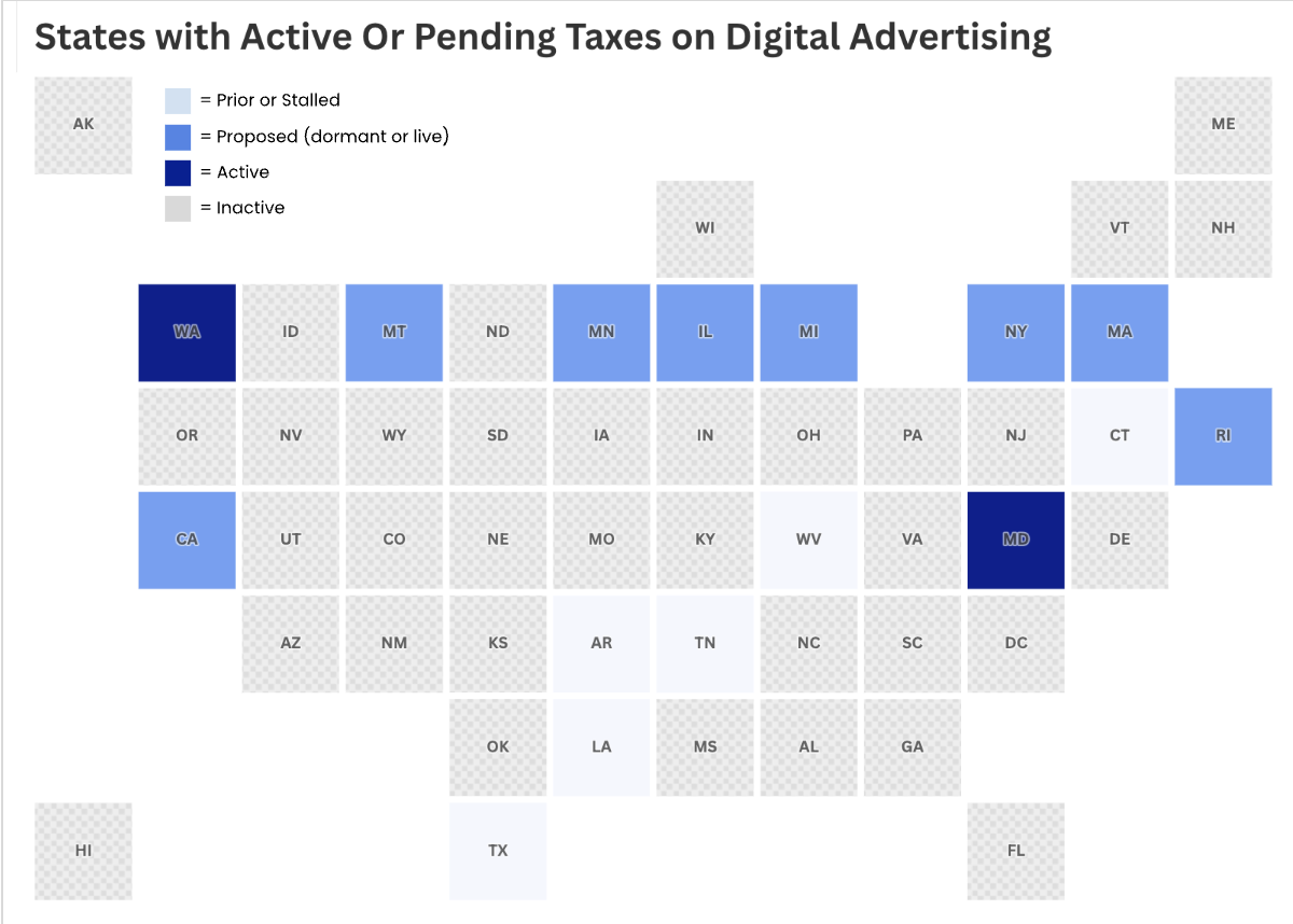 Illinois: While a 10% tax on digital advertising was considered for the FY 2026 budget, it was ultimately not included in the final measure passed in June 2025 due to industry opposition, but is being revived for FY 2027 as HB 4894 and SB 3353 .
